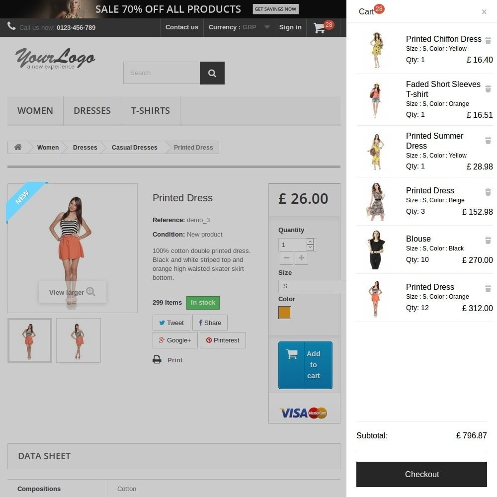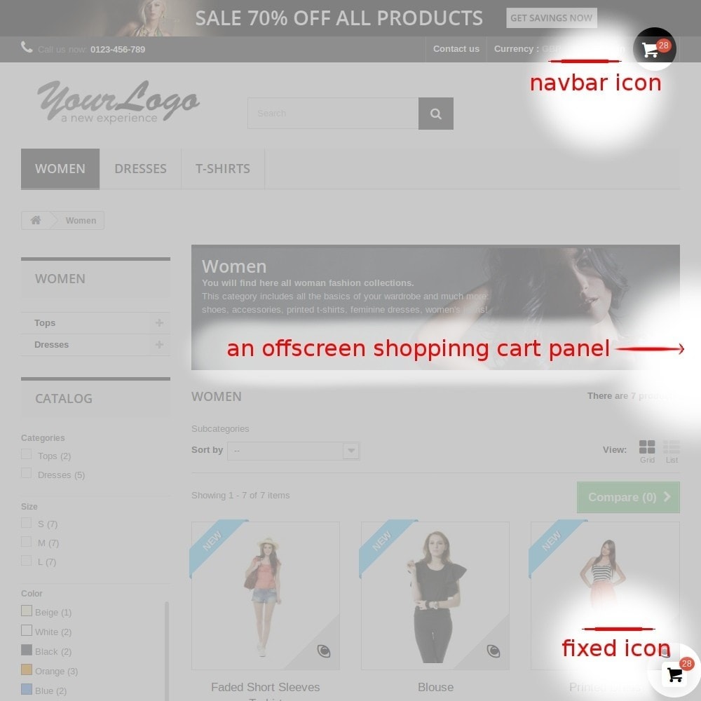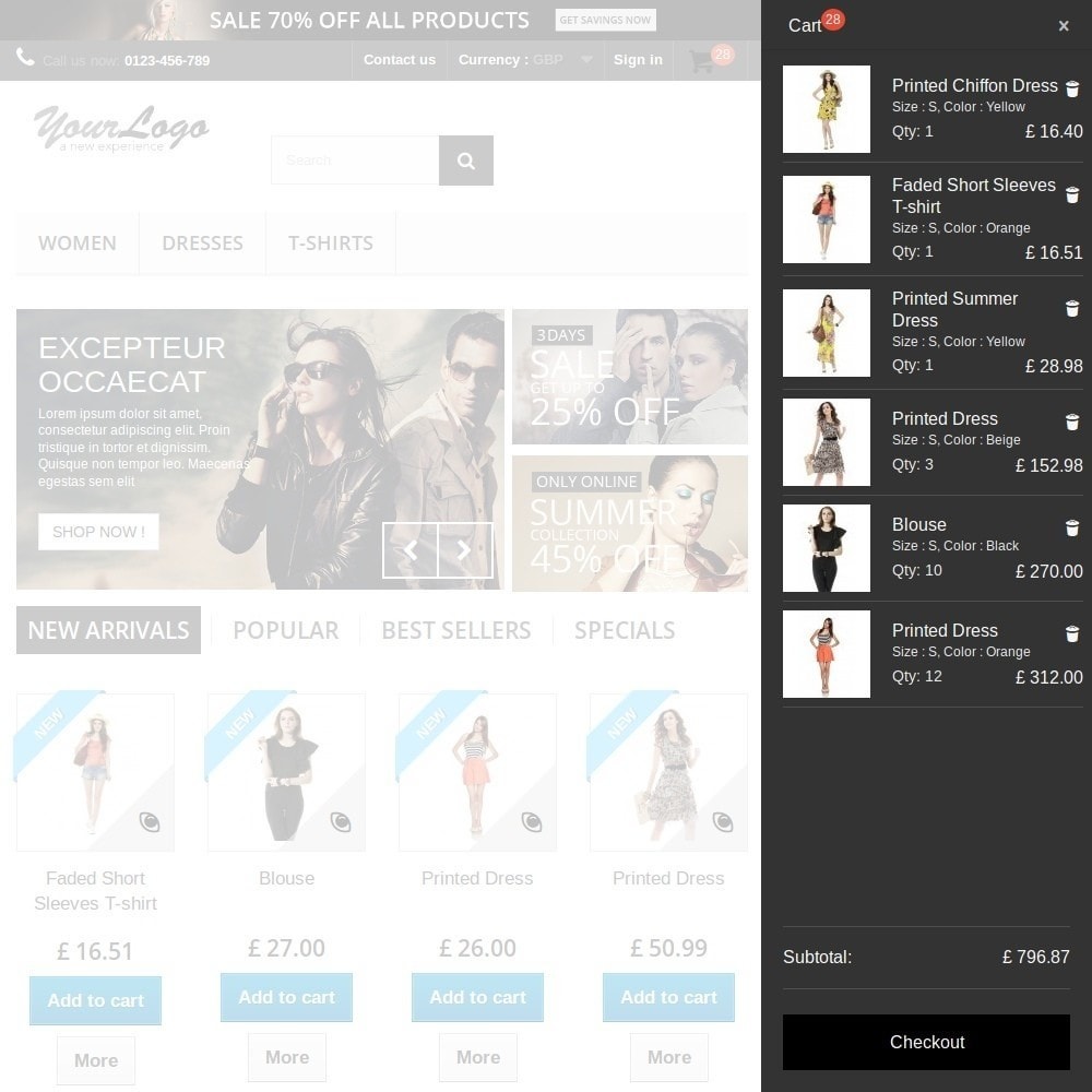 - Elegant sliding cart panel that opens automatically after adding a product